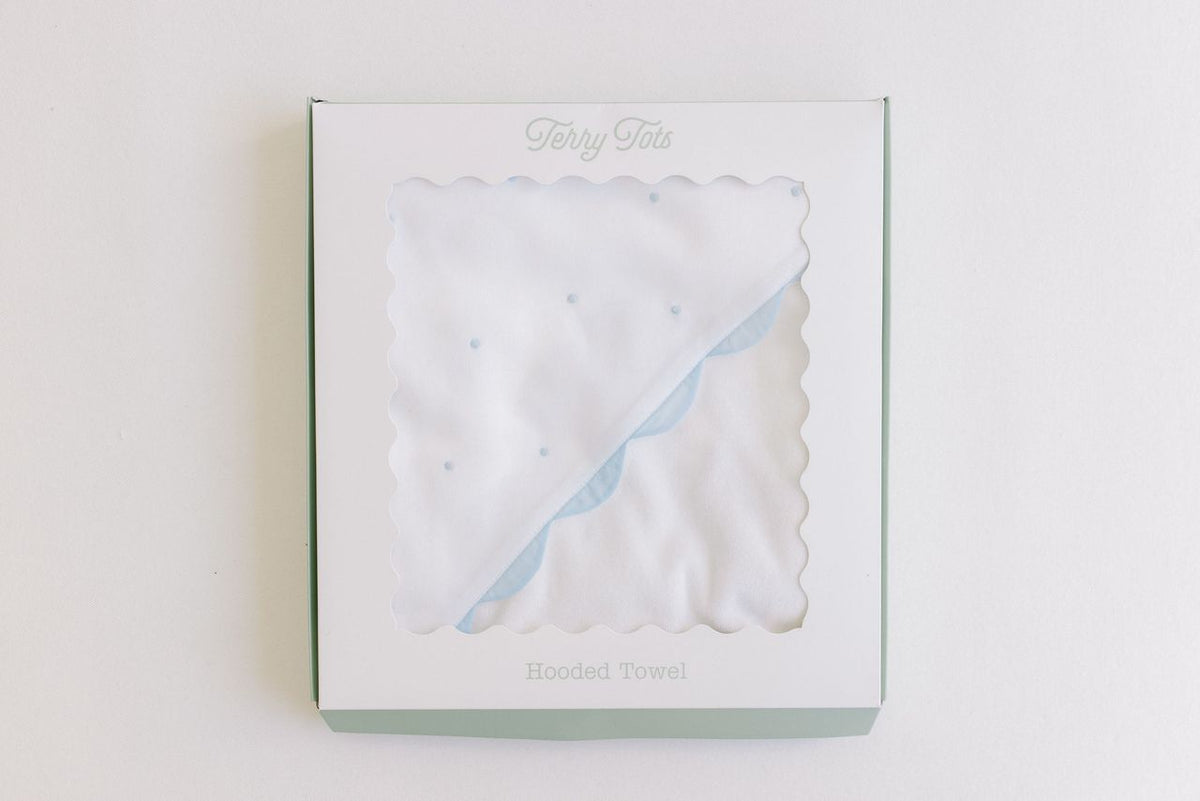 Terry Tots Hooded Towel in White with Blue Embroidered Dots